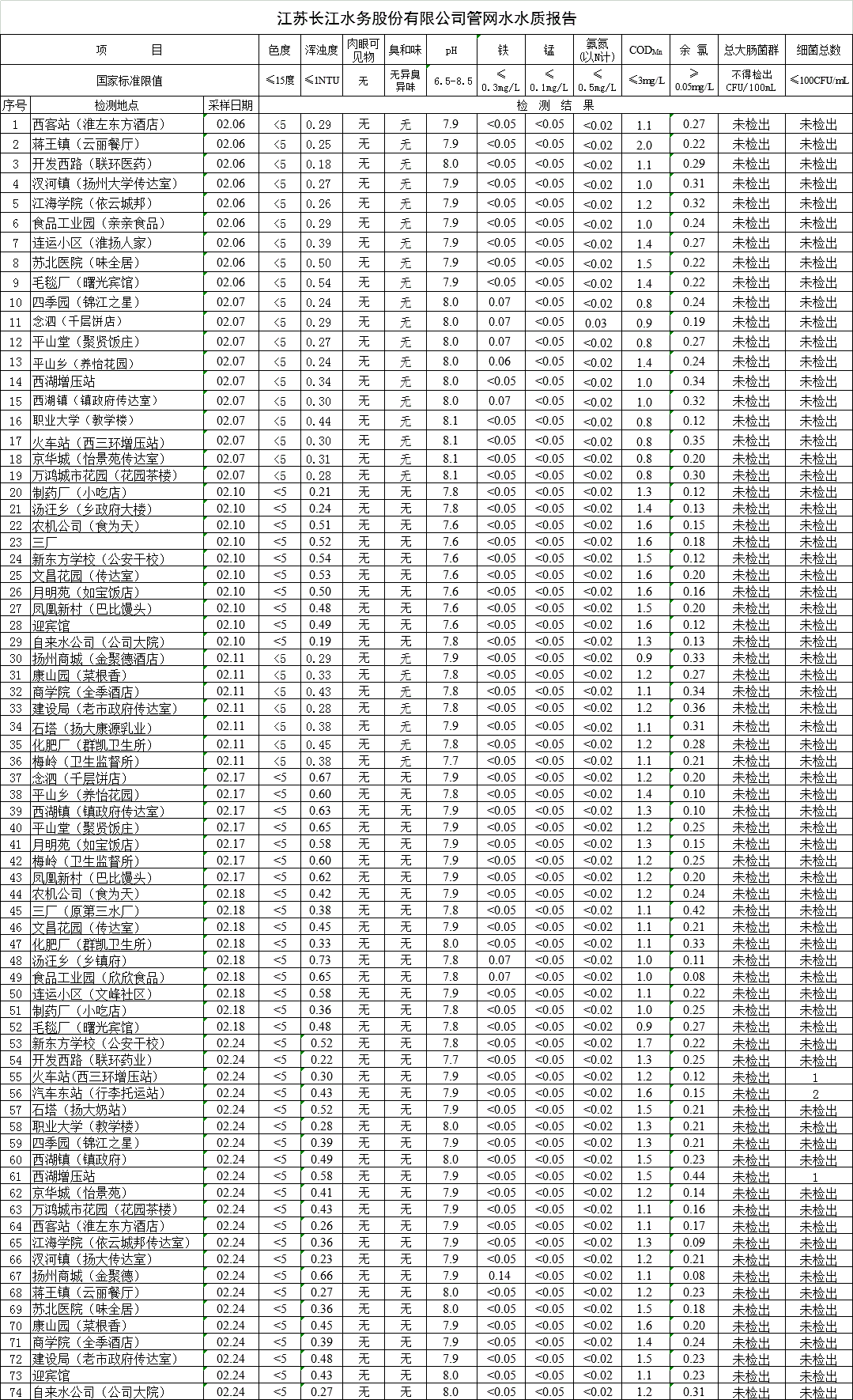 江蘇長江水務股份有限公司管網水水質報告(2020年2月)