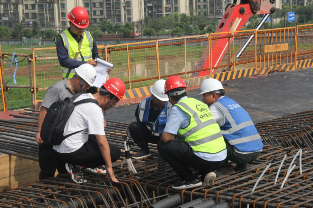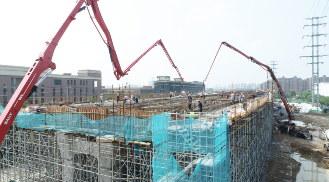 時(shí)值梅雨季節(jié),持續(xù)的降雨天氣給項(xiàng)目施工帶來(lái)了諸多不便。為確保人員安全及工程穩(wěn)步推進(jìn),項(xiàng)目部克服了現(xiàn)場(chǎng)10KV和220KV高壓線及梅雨季節(jié)影響,科學(xué)優(yōu)化施工方案、倒排節(jié)點(diǎn)工期、細(xì)化施工計(jì)劃,在做好模板拼裝預(yù)壓、鋼筋綁扎等工作的同時(shí),明確分工、責(zé)任到人,為兩聯(lián)箱梁的順利澆筑提供先決條件。
