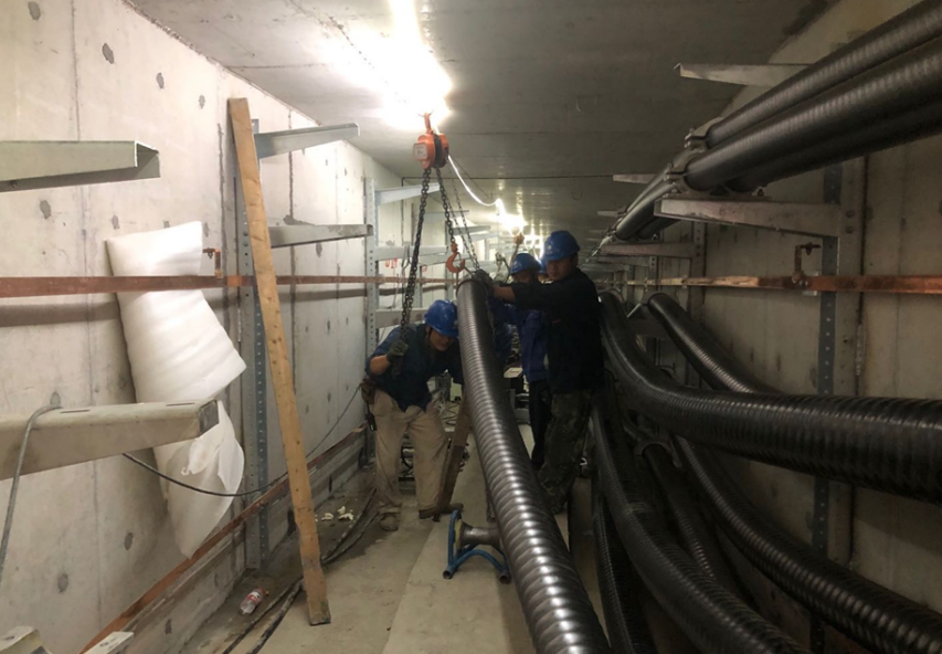 為了確保工程安全有序進行,電纜敷設(shè)前,電力人員對每個井位的地形、地貌都要進行仔細勘察,并對電纜下井地點進行詳細安排。電纜敷設(shè)期間,每天有80多名工人在現(xiàn)場,他們借助機械,將電纜從沉井滑入電力管廊,再借助機械輸送到安裝地點。電纜敷設(shè)時,每隔一定距離串聯(lián)一臺電纜輸送機,每兩臺輸送機之間布置若干電纜滑車。電纜如果需要轉(zhuǎn)向,則會配備電纜轉(zhuǎn)角滑車。在敷設(shè)過程中,為保證電纜頭始終處于拉直狀態(tài),還設(shè)有專人負責電纜頭牽引,并觀察各個電纜輸送機和滑車的運行情況,以防止敷設(shè)中電纜蹦出而損壞電纜保護套。