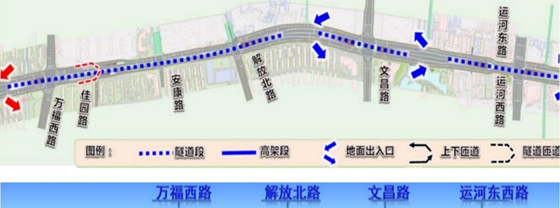 運河南北路快速化改造工程(施井路-二里橋路南)項目起自二里橋路南,終至施井路北,項目總長1440米,是整個運河南北路快速化改造工程的關(guān)鍵節(jié)點工程。項目新建快速路雙向六車道,兩側(cè)地面輔路雙向六車道,與文昌中路、運河西路交叉口采用下穿隧道方式穿越。其中,文昌中路隧道全長470米,暗埋段83米;運河路隧道全長561米,暗埋段201米。項目建設(shè)對推進揚州城市發(fā)展、完善城市快速路網(wǎng)、緩解老城交通擁堵以及提升城市形象有著十分重要的作用。