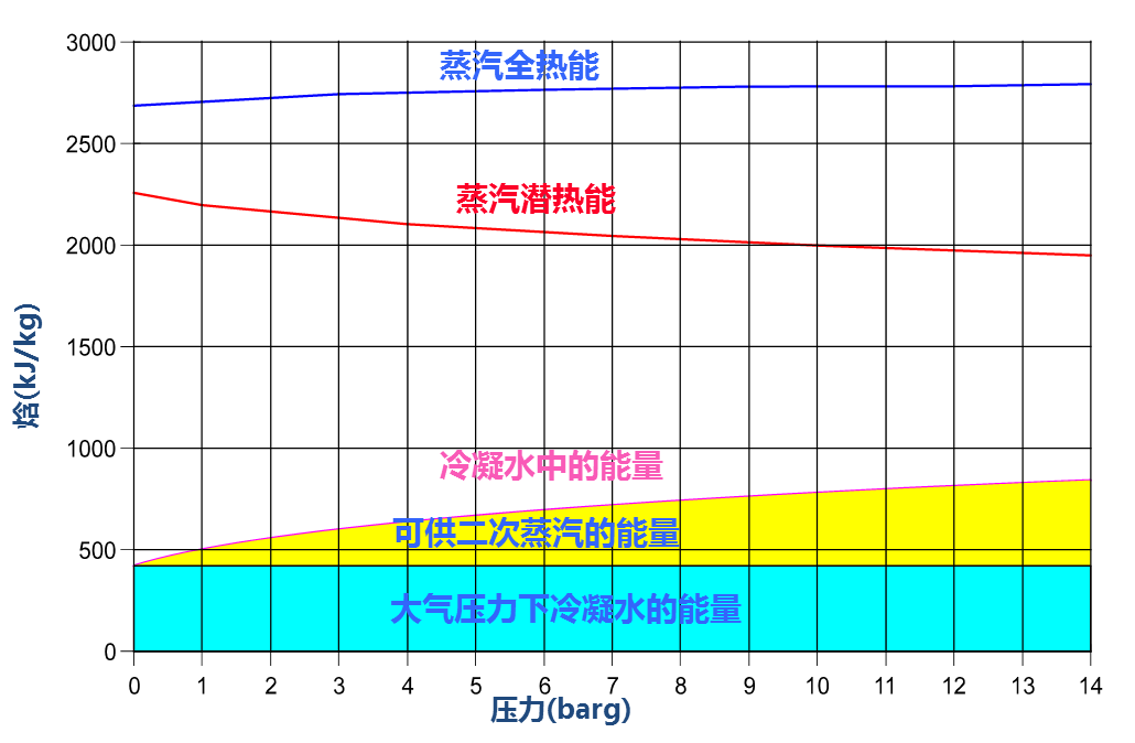 冷凝水所含有的高熱量,回收可實現節能、降低蒸汽消耗,如下圖黃色部分即為可回收利用的熱量: