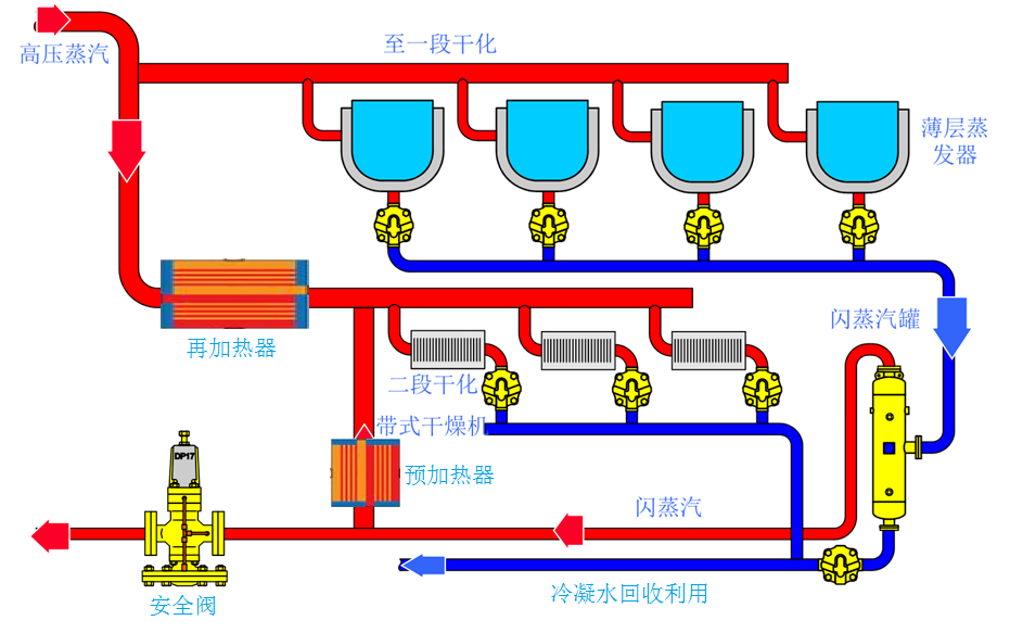 來自薄層蒸發器的疏水閥排出的高溫、高壓冷凝水全部進入閃蒸罐進行閃蒸分離,產生的閃蒸蒸汽進入預加熱器,預加熱器對帶式干燥機內循環空氣進行加熱,當溫度不能滿足生產要求時,開啟再加熱器對循環空氣進行再次加熱。閃蒸罐分離后的冷凝水通過底部疏水閥與預加熱器排出的冷凝水匯合后排入現有蒸汽冷凝水箱。閃蒸罐上設置安全閥,當系統異常,安全閥打開泄壓。