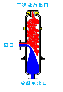 閃蒸罐是一種重要的節能裝置,常用于蒸汽凝結水的余熱回收。凝蒸汽結水沿閃蒸罐切線進入罐內,根據流體兩相流和渦流分離理論,在罐內擴容后,壓力降低,在罐內產生閃蒸汽,引入低壓蒸汽管道,進入再加熱器,對循環空氣進行加熱,使原來低品質的熱能重新得到利用。聚集在下部的飽和凝結水流入,經疏水閥后流到凝結水罐。