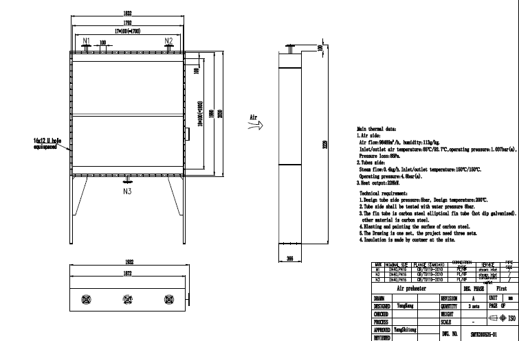 對每條線的現有預加熱器進行改造,根據現有尺寸、接口改造為蒸汽、空氣換熱的管殼換熱器,預加熱器改造圖如圖4: