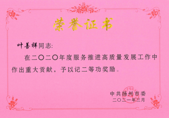 3月31日,在全市高質量發展總結表彰大會上,城控集團被表彰為2020年度市級機關績效考評“一等等次單位”,這是集團轉型發展以來連續四次、歷史第七次獲得該項殊榮。集團黨委書記、董事長葉善祥榮立二等功。