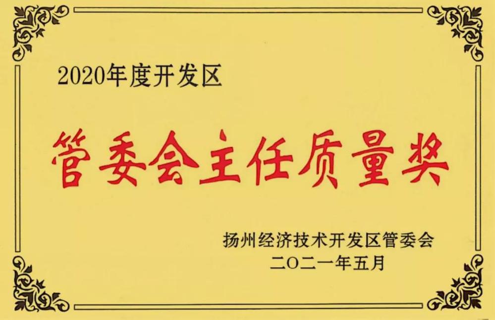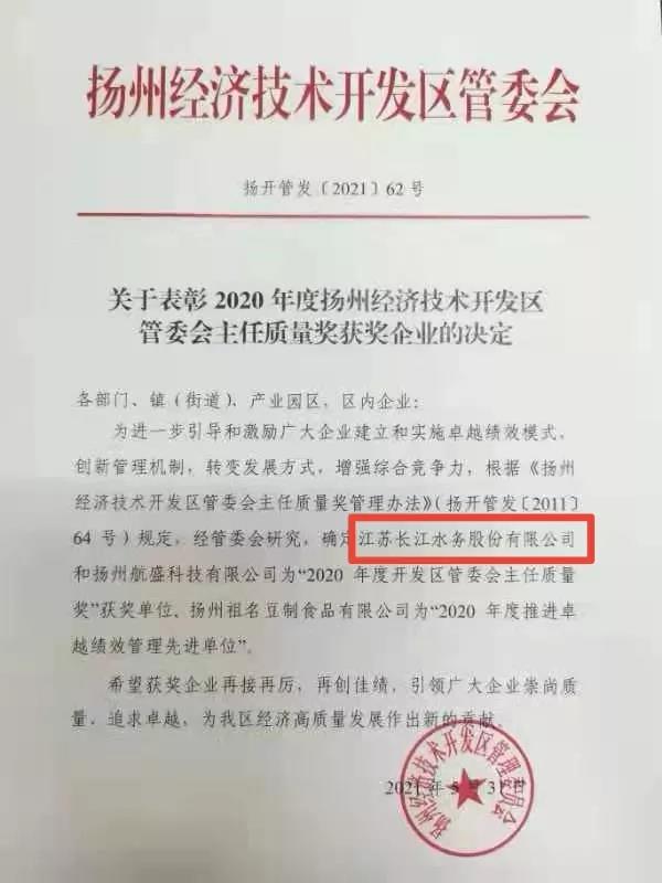 6月4日,揚州市經濟技術開發區召開全區質量大會,表彰在質量管理方面取得突出成效的企業組織,長江水務公司榮獲“2020年度開發區管委會主任質量獎”。