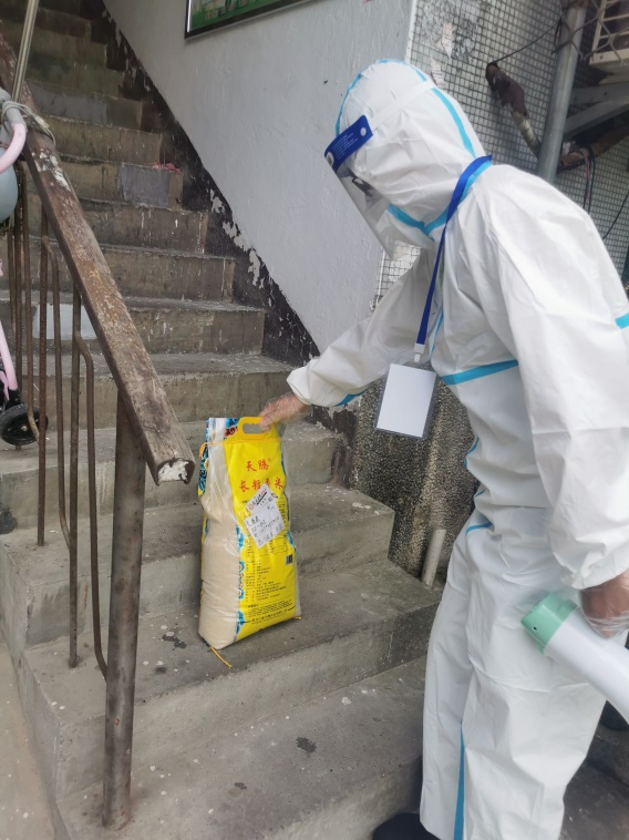 替居民運送物資也是志愿者們每日的重要工作,那么多居民居家隔離,不準外出,菜哪里來?米哪里來?志愿者們承擔了居民樓棟間的送貨員?!?1棟205,早飯給你放在樓梯口臺子上了,請下來拿一下!”“喂,你好是23棟403的劉**啊?你家的大米到了,放在樓梯口了,請自取一下!”