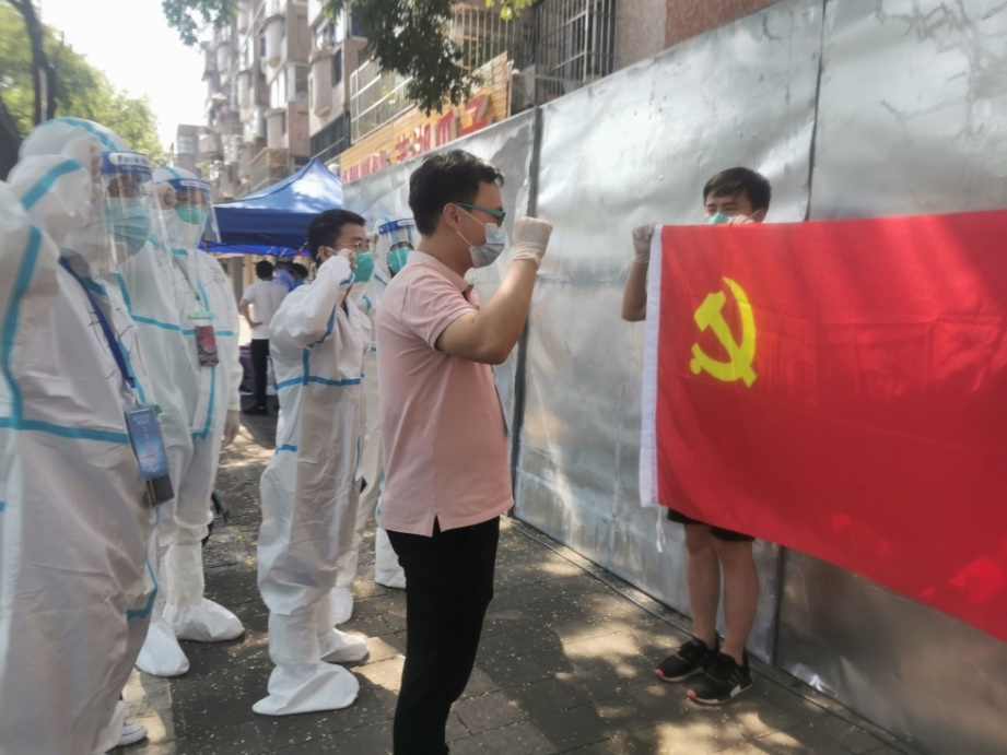 “我志愿加入中國共產(chǎn)黨,擁護(hù)黨的綱領(lǐng),遵守黨的章程,履行黨員義務(wù)……”,行動臨時黨支部書記吳健帶領(lǐng)大家在疫情封鎖區(qū)域卡點處莊嚴(yán)宣誓,全體黨員高舉右拳,面向黨旗,許下錚錚誓言,鏗鏘有力的入黨誓詞回蕩在卡點上空。