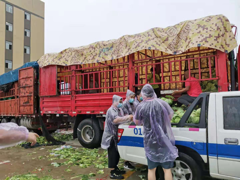 14:30,天空開始飄起雨點,大家依舊堅守在各自的崗位上,很快雨點就打濕了衣服和頭發,可現場沒有一個人退下躲雨。“這車卸得差不多了,我們去那邊幫忙”,“邗江區轉運蔬菜的車來了,需要10個人裝車”,“我去”“我也去”,現場只有時不時這樣的聲音傳來。