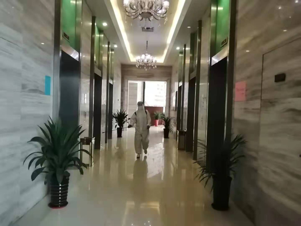 除了大廈日常運行和進出管控工作外,為進一步減少人員流動,防疫的另一項重要工作——消殺,也由項目駐守人員接替保潔來完成。他們通過電話和視頻向保潔人員詳細學習了消毒的方法,消毒工具如何操作,哪里需要大面積噴灑,哪里需要用消毒液擦拭……兩名工作人員在做好日常巡查、維護的同時,每天2次對國泰大廈大廳、電梯廳、轎廂和有人員進出的樓層進行消毒,門把手、垃圾箱、扶手、按鍵也都不會被遺漏。