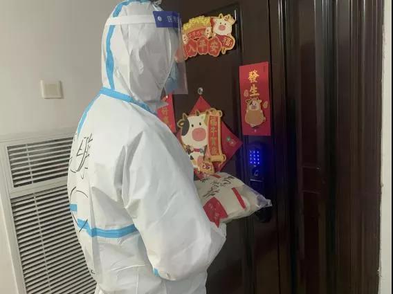 說干就干,大家迅速翻找出此前已經整理好的業主資料和信息,從中挑選出空巢老人住戶和封閉隔離住戶,然后換上防護服,推上小推車,前往各樓棟,進行分發。分發時,還細心詢問了業主的口味,盡量滿足大家的喜好。