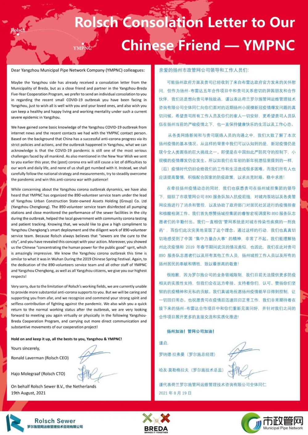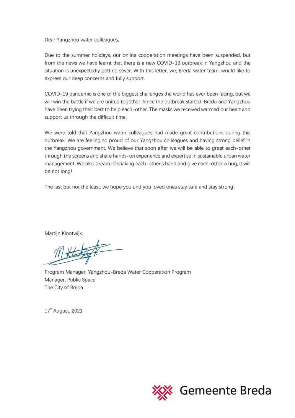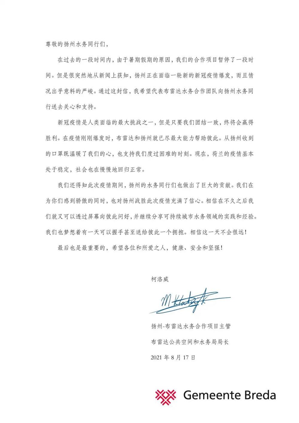 8月18日,在我市新冠肺炎疫情防控的攻堅時刻,城控集團收到荷蘭布雷達市公共空間和水務(wù)局以及羅爾施管網(wǎng)運維管理技術(shù)咨詢有限公司發(fā)來的暖心慰問函。信函中,布雷達市公共空間和水務(wù)局局長馬丁·科洛威先生以及羅爾施管網(wǎng)運維管理技術(shù)咨詢有限公司總經(jīng)理羅納德·拉弗曼先生對我市正在蔓延的新冠肺炎疫情表示關(guān)切;向身處疫情中的廣大城控集團員工及家人表示誠摯的問候,對“890管網(wǎng)服務(wù)隊”代表的“城控”抗疫志愿者奮戰(zhàn)“疫”線的擔(dān)當(dāng)精神,致以崇高的敬意。這封遠隔重洋飛馳而來的慰問信,彰顯了兩座城市間彌足珍貴的友誼,也增強了“城控人”打贏這場疫情防控阻擊戰(zhàn)的信心。