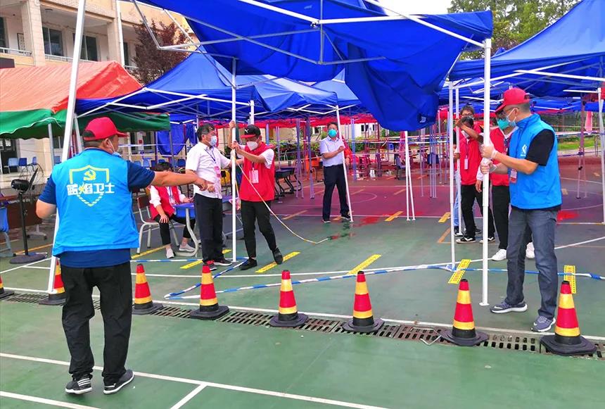 9月2日清晨,天空陰云密布。早6時許,第三組26名志愿者全部到達檢測地點——朱自清小學,大家按照分工職責,各就各位,忙著核酸檢測前的準備工作?!敖裉煊杏?,請志愿者抓緊時間再檢查一下帳篷和支架……”季紅軍提醒道。6:30,檢測順利開始;7:35,小雨不期而至;7:45,大雨傾盆而下,很快,雨水順著風向在帳篷凹陷處形成積水,積水越來越多,幾名志愿者拿出早已準備好的木棍,找好角度,用木棍將積水推出,并不時提醒居民注意安全。光伏公司志愿者蘇峰強忍腰疾,和大家一起全然不顧全身濕透,如此反復直至8:30雨水漸止,確保了核酸檢測順利進行。