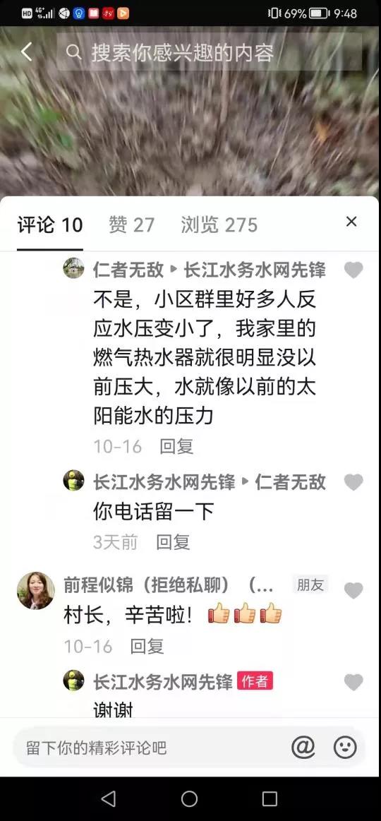 “水網先鋒”立即轉換私信“仁者無敵”,并留下聯系電話,不一會,“仁者無敵”就把電話打過來了,他介紹自己姓趙,住在念香苑38幢頂樓,以前水壓正常,自去年底小區改造后,樓上水壓明顯感覺小,但還能維持家用。“水網先鋒”隨即向技術人員了解,得知念香苑小區在去年底小區改造時并沒有對自來水管道進行改造,而是改造的下水管道。搶維修中心及時向“仁者無敵”做了詳細解釋,并幫網友將水壓小的問題反應到公司職能部門處理,得到“仁者無敵”的高評,他說無意中刷抖音刷到“水網先鋒”抖音號的,沒想到留言立即得到了耐心的回復,非常感激。