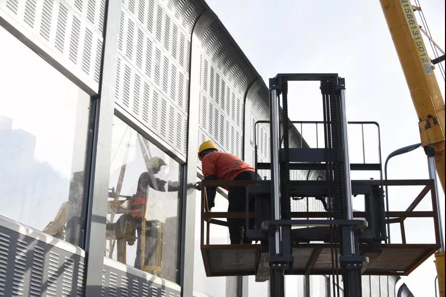11月14日,伴隨著最后一片屏體在起吊機(jī)的操縱下緩緩落位,工人師傅們不慌不忙地對聲屏障進(jìn)行安裝,經(jīng)過幾十分鐘的精細(xì)調(diào)控,江廣快速路主線高架聲屏障已全部安裝完成。
