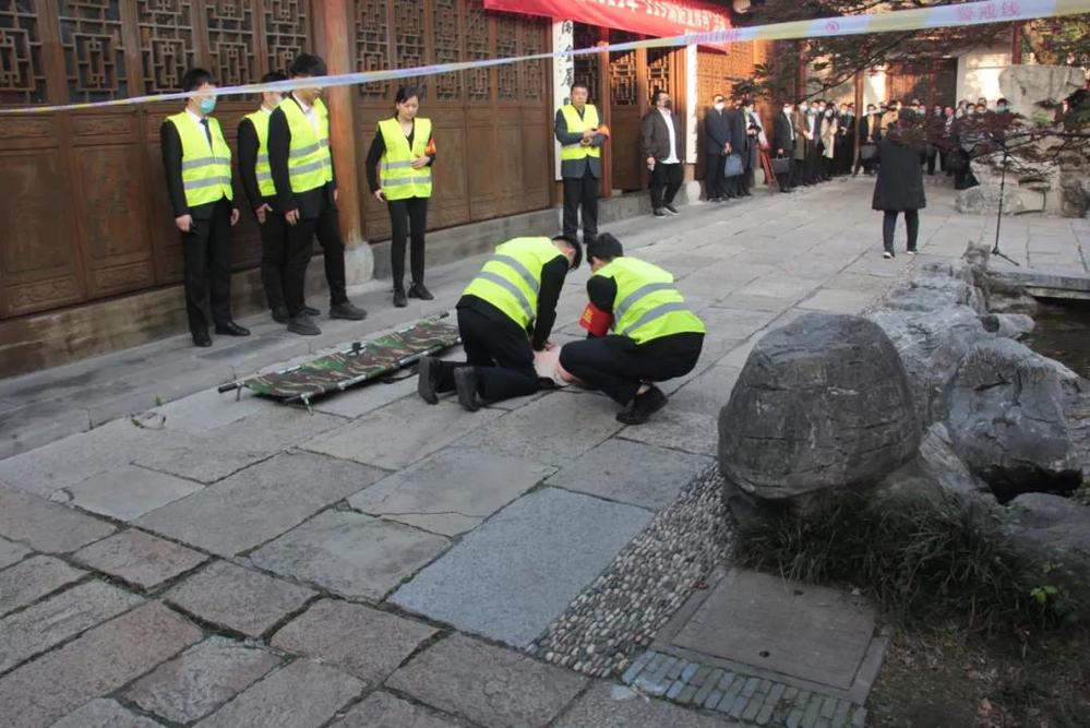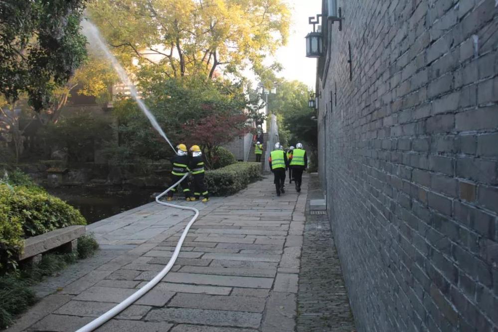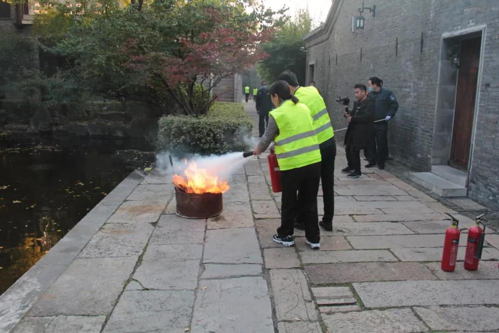 會后,全體人員在長樂客棧湖心亭,共同觀摩了由名城公司組織開展的“119”消防應急疏散與滅火演練活動。