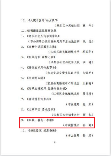 為進(jìn)一步傳承好家訓(xùn)、弘揚(yáng)好家風(fēng),傳播家庭向上向善的正能量,營(yíng)造良好的家庭氛圍,深入推進(jìn)家庭文明建設(shè),城控集團(tuán)行業(yè)婦聯(lián)積極響應(yīng)市婦聯(lián)開展的“曬家訓(xùn)格言.講家風(fēng)故事”為主題的好家風(fēng)好家訓(xùn)征集活動(dòng),在集團(tuán)基層企業(yè)中進(jìn)行了廣泛發(fā)動(dòng),層層篩選,最終共選送了5條家訓(xùn)格言、5個(gè)家風(fēng)故事參評(píng)市婦聯(lián)活動(dòng)。經(jīng)專家評(píng)審和群眾投票評(píng)選,近日,揚(yáng)州市婦聯(lián)對(duì)優(yōu)秀作品進(jìn)行了通報(bào),集團(tuán)共有4個(gè)作品獲評(píng)“優(yōu)秀家訓(xùn)格言”、“優(yōu)秀最美家風(fēng)故事”。