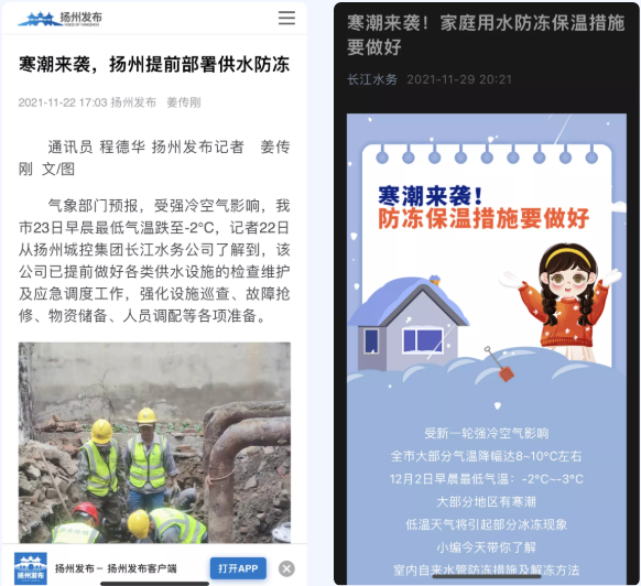 密切關注寒潮降溫天氣預報,通過微信公眾號、門戶網站、手機短信發布自來水防凍信息,并在新媒體單位進行滾動播報,加密自來水防凍宣傳頻次,提醒用戶做好防范準備。寒潮降溫前,公司派抄表員上門通知各大小區物業,告知自來水防凍保溫事項,同時在營業大廳向用戶發放宣傳單,擴大防寒防凍宣傳效應。