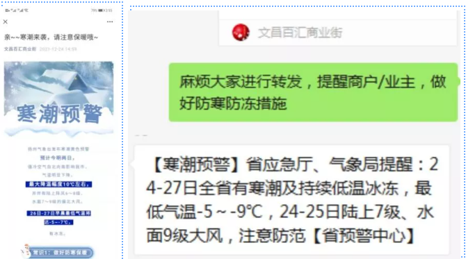 文昌百匯企劃部立刻撰寫“防寒防凍溫馨提示”,在微信公眾號和業(yè)主群同步發(fā)布,增強(qiáng)業(yè)主、商戶防寒防凍意識,督促業(yè)主、商戶及時落實應(yīng)對措施,做好自身防護(hù);同時提醒業(yè)主注意用電用水安全。
