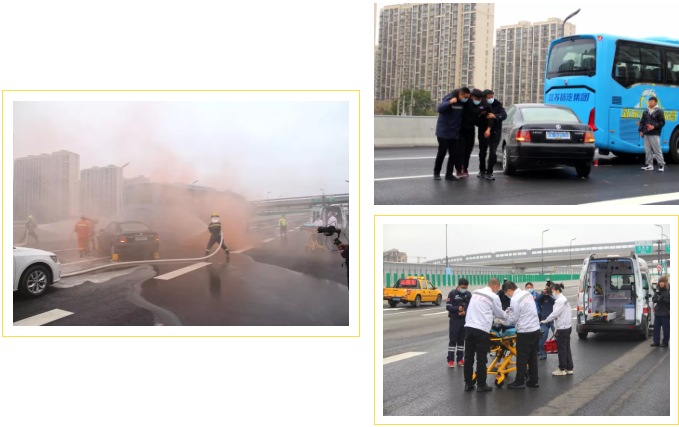 此次演練模擬場(chǎng)景為“受低溫雨雪冰凍天氣影響,高架橋上發(fā)生追尾,3人受傷、被困,現(xiàn)場(chǎng)行車中斷……”。經(jīng)各相關(guān)部門逐級(jí)上報(bào),啟動(dòng)《揚(yáng)州市快速路隧道交通事故處置應(yīng)急預(yù)案》Ⅲ級(jí)響應(yīng)后,市住建局、市應(yīng)急管理局、市公安局、市消防救援支隊(duì)、市衛(wèi)健委等部門立即組織救援隊(duì)伍趕赴事故現(xiàn)場(chǎng)進(jìn)行處置。事故現(xiàn)場(chǎng),在指揮部的統(tǒng)一指導(dǎo)下,各部門安全高效地完成了車輛疏導(dǎo)、救援駕乘人員、滅火處理等工作,避免了交通擁堵,事態(tài)擴(kuò)大和危害蔓延。整個(gè)應(yīng)急演練活動(dòng)近35分鐘,演練過(guò)程有條不紊,達(dá)到了貼近實(shí)戰(zhàn)、以練促訓(xùn)的效果。