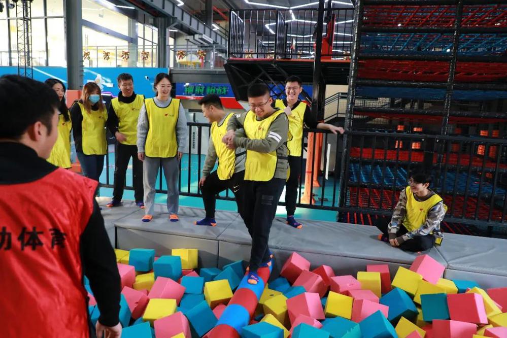 活動開始前,教練組織大家進行熱身。隨后,參加活動的青年們分為4組,教練指導大家組建團隊,開展分組“破冰”,每個組經過討論制定出了自己的隊名和宣傳口號,依次完成了素質訓練、風采展示等環節。拓展活動形式多樣,內容豐富,大家興致勃勃參加了蹦床、智勇沖關、躲避球、海綿池大作戰等項目。在熱烈歡快氛圍下,各組通力合作完成全部挑戰任務,現場不時傳來歡聲笑語,加油助威聲此起彼伏。