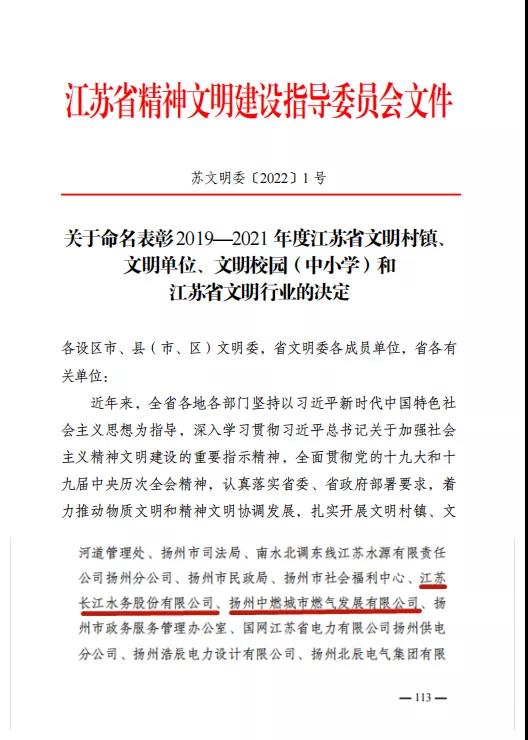 近日,省文明委通報《關于命名表彰2019—2021年度江蘇省文明村鎮、文明單位、文明校園(中小學)和江蘇省文明行業的決定》,城控集團所屬江蘇長江水務股份有限公司、揚州中燃城市燃氣發展有限公司兩家單位榮獲“2019—2021年度江蘇省文明單位”稱號。