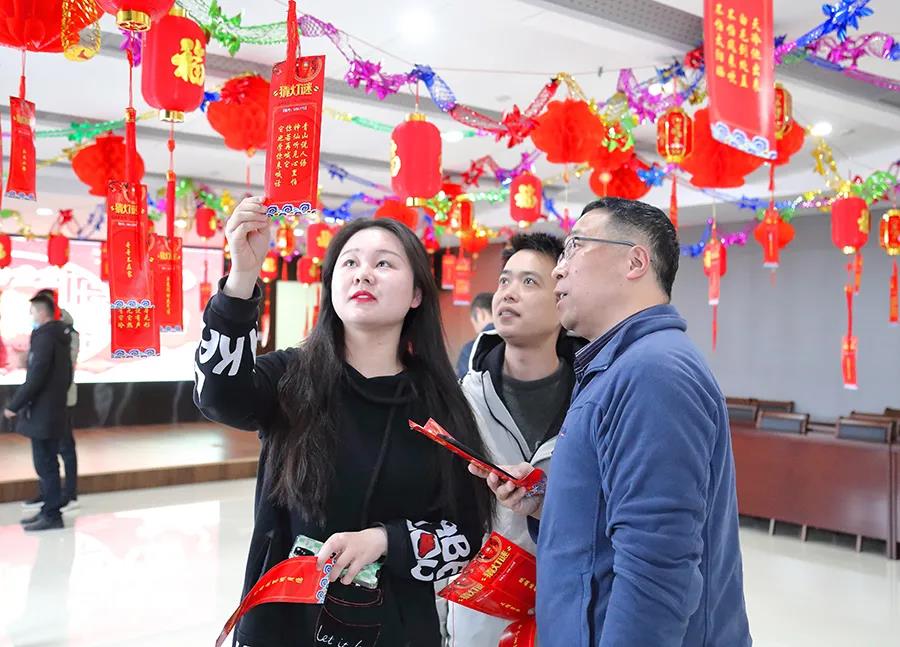 活動現場布置的喜慶熱鬧、富有創意,謎面包括安全、廉政、保健、文學、詩詞、地名等,集知識性和趣味性。一盞盞火紅的燈籠懸掛在大廳,一張張“燒腦”的燈謎垂墜燈籠之下,引導著職工們穿梭徜徉在“謎林”中。職工們站立在燈籠邊,翹首看著謎面喃喃低語,思索著謎底,現場氣氛十分活躍,構成了一幅歡樂祥和的畫面。兌獎現場更是排成了長龍,大家憑猜出的謎面,興高采烈在領獎處兌換了各種獎品。