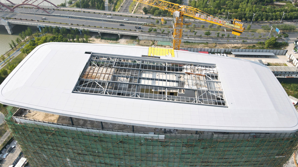 2022年5月,揚州頤和醫療健康中心項目室外裝飾已初具雛形。目前,項目東南裙樓、中間鋼裙樓鋼結構穹頂、北塔樓屋面飄架區域的腳手架及安全網已拆除,外裝飾效果芳容初現。