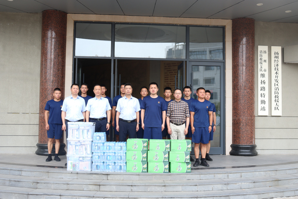 7月21日上午,潔源光伏公司負責人一行赴揚州市消防救援支隊走訪慰問,為炎熱酷暑中堅守在消防救援一線的消防指戰員送去清涼解暑慰問品。