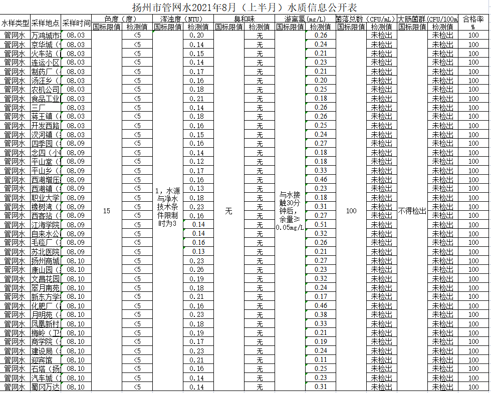 揚州市管網(wǎng)水2021年8月(上半月)水質(zhì)信息公開表