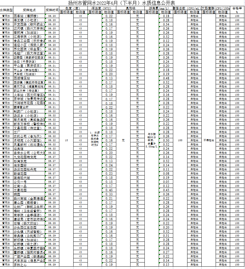 揚州市管網水2022年6月(下半月)水質信息公開表