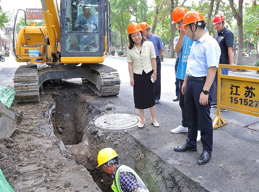 潘涵一行首先查看了鹽阜東路老舊燃氣管道改造施工現場。潘涵詳細了解了老舊管網改造工程建設情況,檢查了現場安全管控措施、人員安全防護和安全警示標志等重點工作落實情況。潘涵指出,老舊燃氣管道改造是一項惠及千家萬戶的民生工程,要按照管道施工相關要求規范作業,利用GPS做好管道精準定位,要加強施工現場管理,做好安全防護、安全宣傳等工作,要確保正常交通秩序,增加現場安全疏導人員,保證行車、行人的安全。