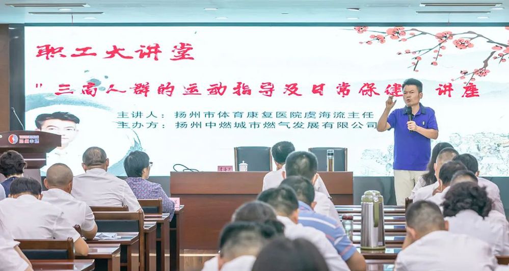 為進一步提高廣大職工健康保健意識,結合公司職工健康體檢情況,8月26日下午,揚州中燃公司工會舉辦第二期“職工大講座”。本期特邀揚州市體育康復醫院慢性病管理兼運動醫學科主任醫師虞海流開展“醫學向黨 健行利民”暨“三高”人群的運動指導及日常保健專題講座。公司黨委副書記、職工代表100余人參加。