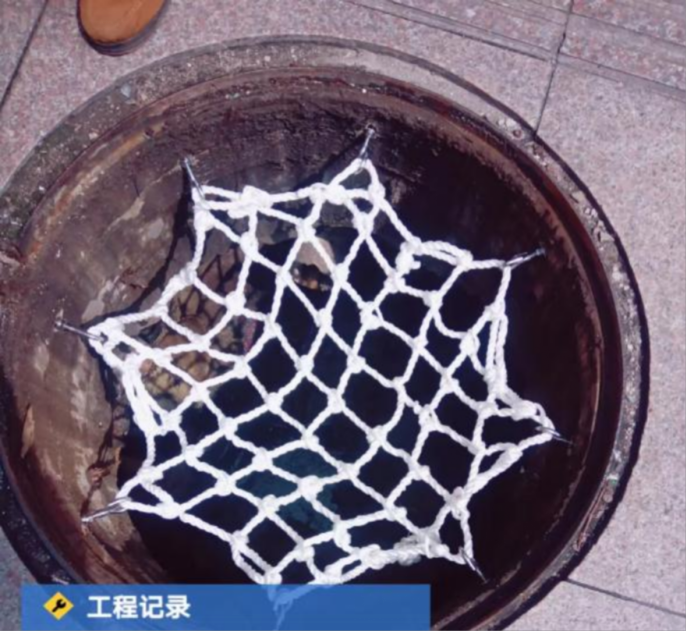 防墜網是加裝在井蓋下方的網兜,而本輪要加裝的防墜網是承重可達500公斤、耐腐蝕、耐磨、防斷裂的高強度尼龍網,它將和緊緊勾住網兜的8個鐵鉤共同組成檢查井內的第二道生命防線,一旦井蓋被破壞或頂開,防墜網便會發揮作用,攔截或緩沖墜落物,避免或減輕可能帶來的傷害。