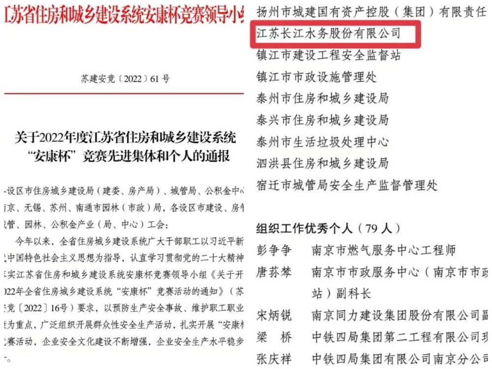 近日,省住建系統安康杯競賽領導小組下發表彰通報,長江水務公司榮獲2022年度江蘇省住房和城鄉建設系統“安康杯”競賽組織工作優秀單位稱號。