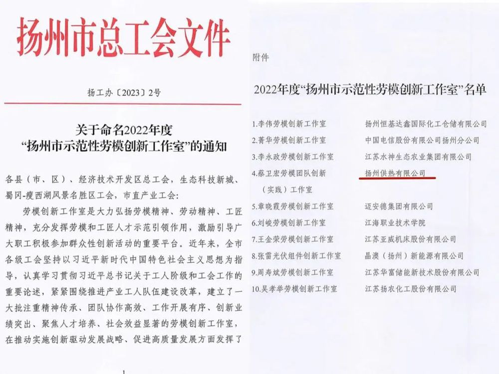 近日,供熱公司勞模團隊創新(實踐)工作室被揚州市總工會授予“揚州市示范性勞模創新工作室”榮譽稱號。