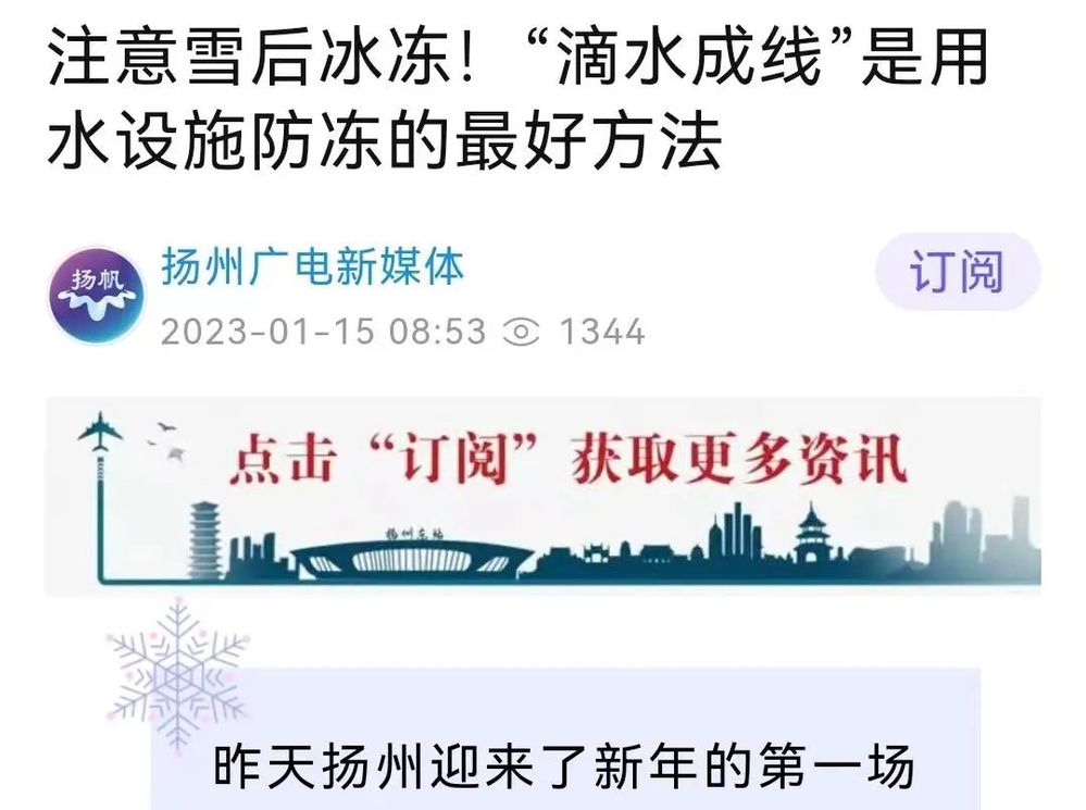 在寒潮降溫前,營(yíng)業(yè)所牽頭組織地面水表的巡查和保溫工作,向居民發(fā)放保溫棉,加強(qiáng)地面水表的保溫工作。同時(shí)拍攝制作微視頻,指導(dǎo)居民采取“穿衣戴帽”“滴水成線”“關(guān)窗防寒”等方式,積極做好防凍保溫的提醒。