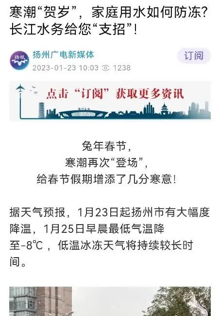 寒潮降溫前,長江水務未雨綢繆,提前準備,加強防凍保溫宣傳,加密信息發布頻次,有效做好防范工作。春節前和春節期間通過手機APP、微信公眾號、電視滾動字幕等渠道,密集發布30多條自來水設施防凍保溫提醒和安全用水服務通知,全方位提醒居民提前防范。