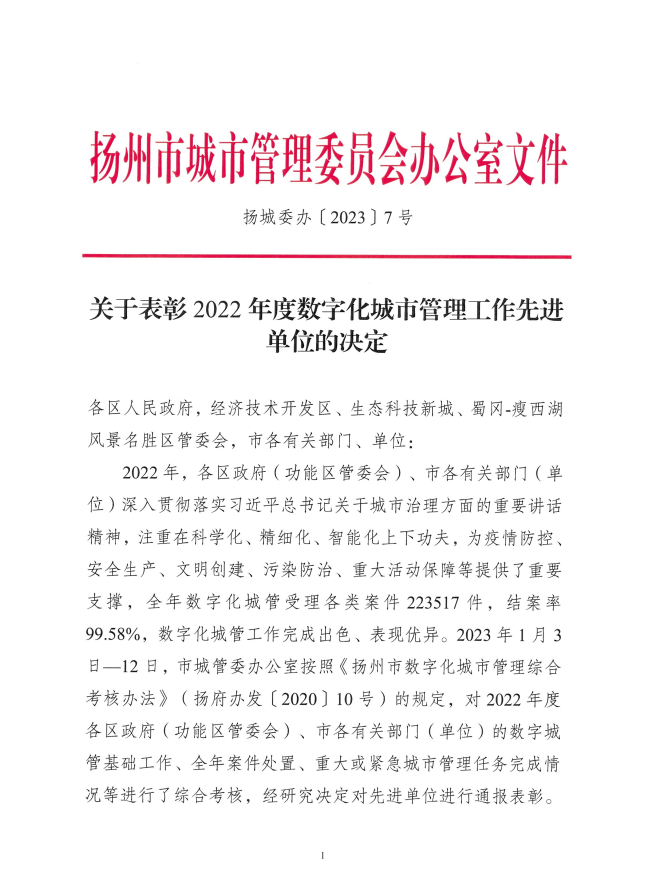 2023年,城控集團將持續做好數字化城管工作,有效落實城市管理責任,加強精細化管理,充分發揮信息化的高效作用,為“好地方”揚州貢獻城控力量。