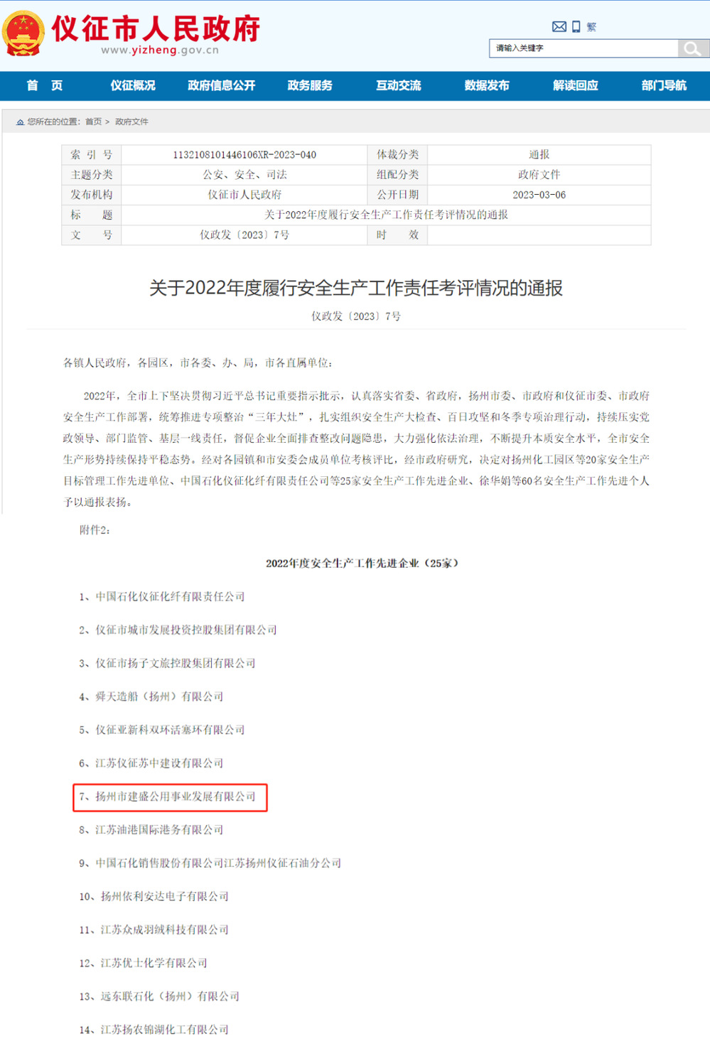 近日,儀征市人民政府通報了2022年度履行安全生產工作責任考評情況,建盛公司榮獲2022年度安全生產工作先進企業。