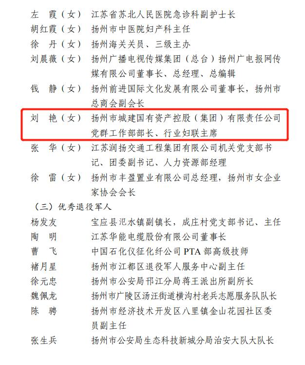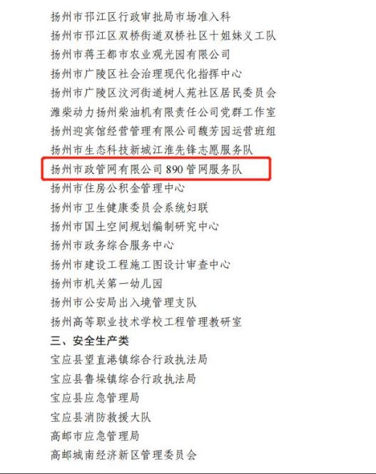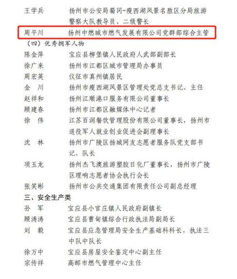 集團(tuán)所屬揚州市政管網(wǎng)有限公司890管網(wǎng)服務(wù)隊獲評“巾幗模范集體”;集團(tuán)黨群部部長、行業(yè)婦聯(lián)主席劉艷榮獲“巾幗榜樣”榮譽稱號;集團(tuán)所屬揚州中燃城市燃?xì)獍l(fā)展有限公司黨群部主管周平川榮獲“優(yōu)秀退役士兵”榮譽稱號;集團(tuán)企管部副部長李剛榮獲“安全生產(chǎn)類先進(jìn)個人”榮譽稱號。