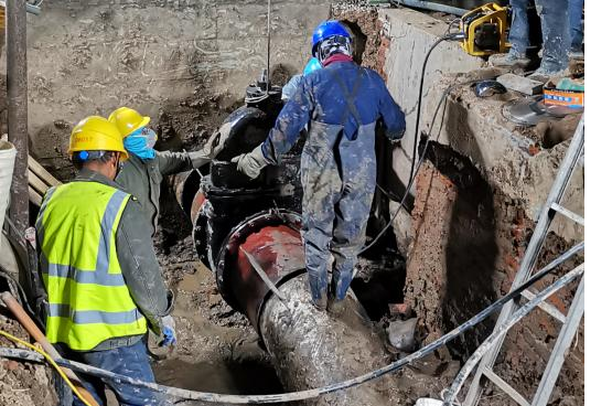 因考慮到本次更換工作作業面小,施工條件差,閥門老舊,施工時長將直接影響第四水廠自來水生產。4月13日上午,公司領導班子成員、施工項目部負責人查勘現場,完善應急保障預案,充分做好技術交底,模排施工流程,所有人員、設備聽令待發,各項準備工作均一一落實落細。下午3點,新裝閥門及管件連接、反光隔離柵欄、切割設備等均放置就位,做好管道碰接最后準備。4月13日20點,施工序幕全面拉開。關閉閥門、排水泄壓、抽排余水、安裝閥門、焊接鋼管、開啟閥門各部門協同配合,現場人員爭分奪秒搶奪進度。