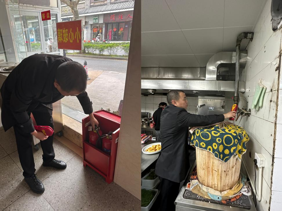 在迅客大食堂,安全員詳細查看了店內消防器材、安全疏散通道等,對燃氣管道、閥體進行氣體泄漏檢查,要求餐飲負責人按消防規定配備應急照明燈、滅火器等消防設備,同時提高安全用氣防范意識,每日定時對店內燃氣設備進行檢查,確保安全無泄漏。