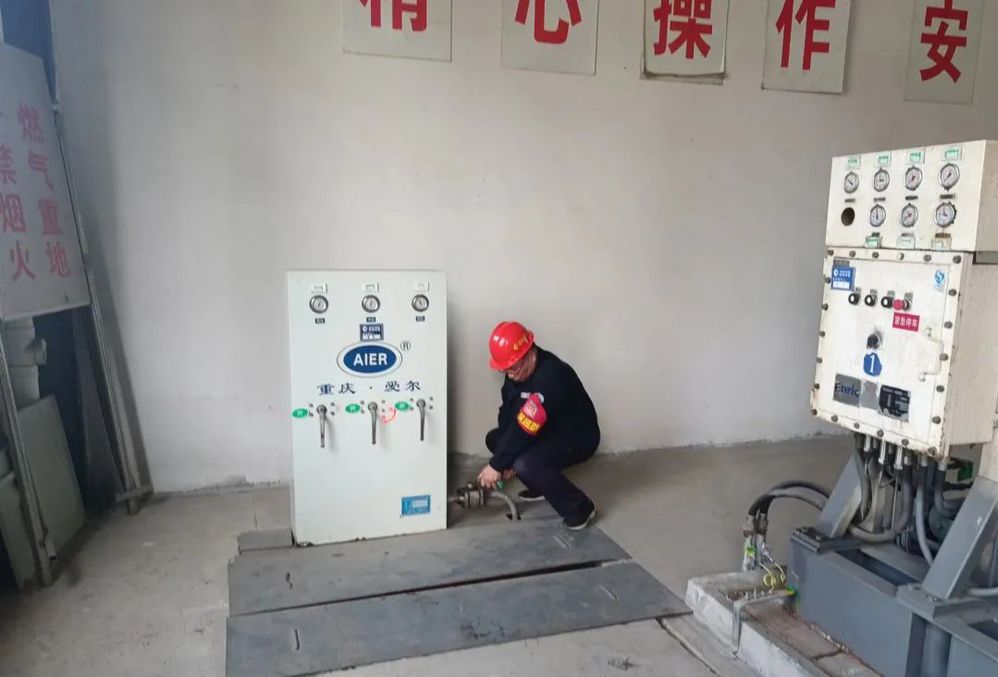 演練圍繞“消除安全隱患,筑牢安全防線”主題,主要模擬壓縮機間內干燥塔閥門突發大量燃氣泄漏,巡查人員發現后立即向當班班長匯報,班長立即啟動應急處置預案,組織人員關停所有站內設備,切斷氣源,疏散現場人員;同時在加氣站出入口設置警戒,禁止無關人員、車輛進入。維修人員到達現場后,及時實施搶修作業,經專業儀器檢測確認燃氣泄漏故障排除后,解除警戒,恢復正常運營。