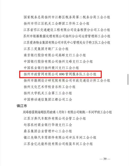 近日,江蘇省總工會表彰了一批省模范職工之家、模范職工小家、優(yōu)秀工會工作者。揚州市政管網(wǎng)有限公司“890管網(wǎng)服務(wù)隊”榮獲“江蘇省模范職工小家”稱號。