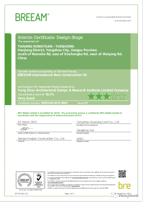 近日,在英國建筑研究院(BRE)的綠色建筑評估體系BREEAM International New Construction國際新建建筑評價中,由城建置業(yè)與華建地產(chǎn)合作開發(fā)的天璟融園項目榮獲三星(VERY GOOD)評級。這是揚州房產(chǎn)市場首個獲得BREEAM三星認證住宅項目。