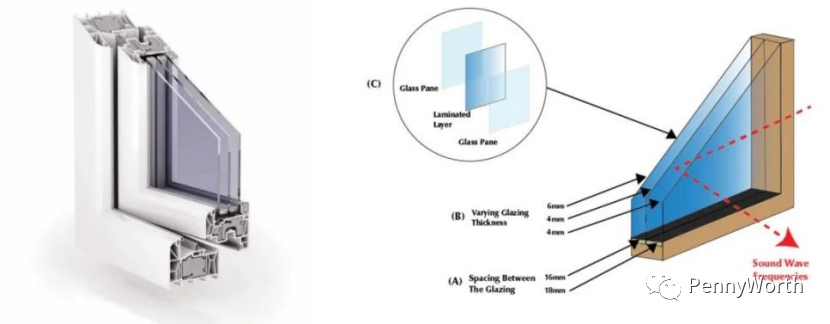 ▲三玻兩腔玻璃隔音降噪原理示意圖