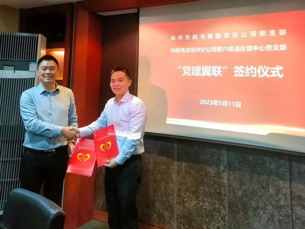 隨后,揚州市民卡公司黨支部與中國電信揚州分公司客戶渠道運營中心黨支部展開了黨建翼聯結對簽約活動。相關負責人圍繞“聯學、聯創、聯享、聯動”方面的黨建共建合作進行了深入細致的交流,就黨建優勢轉化為發展優勢、資源互補提出了建設性建議。