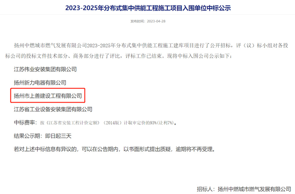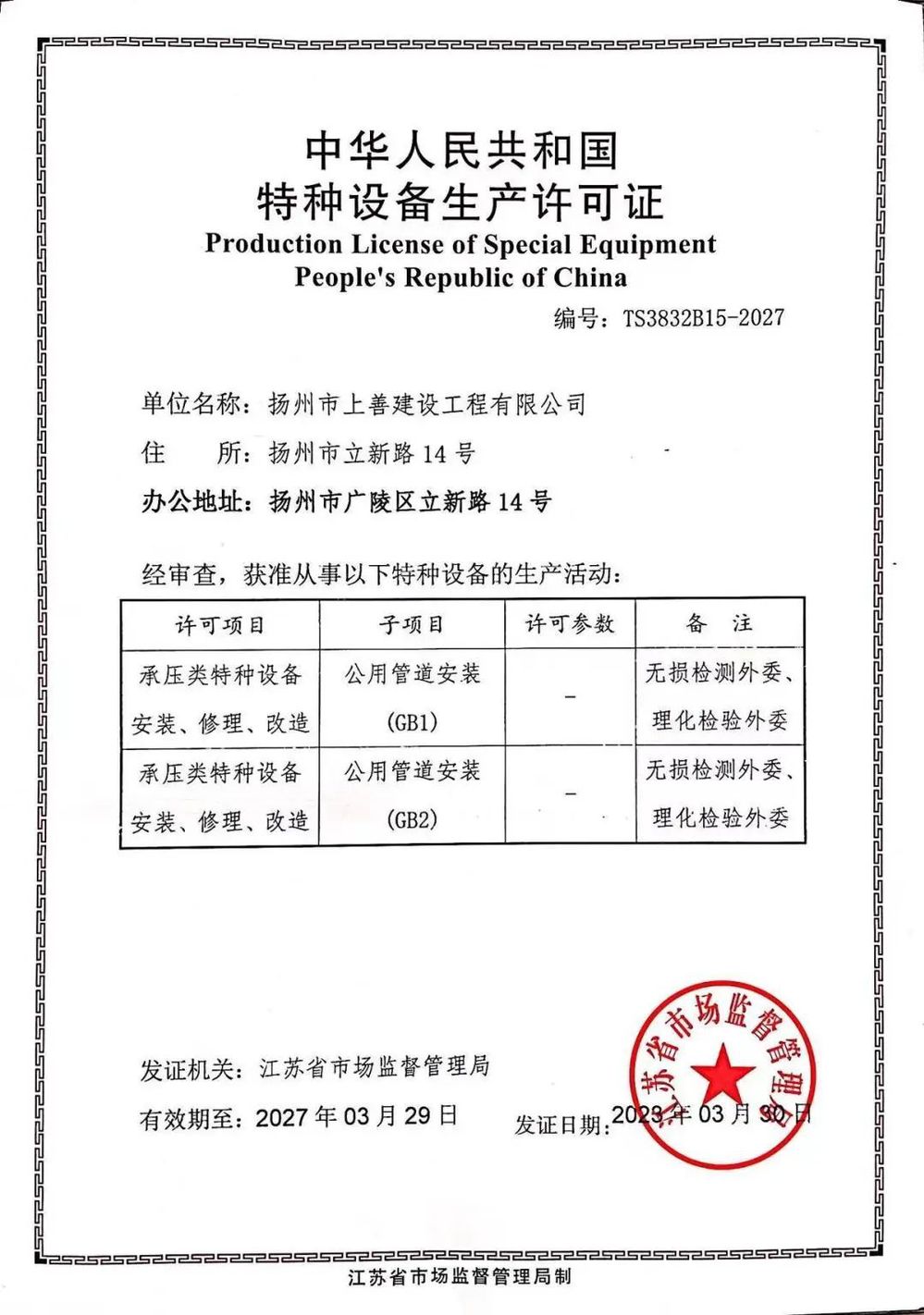 近日,上善公司成功取得特種設備生產許可證,并成功入圍揚州中燃城市燃氣發展有限公司2023-2025年分布式集中供能工程施工庫。