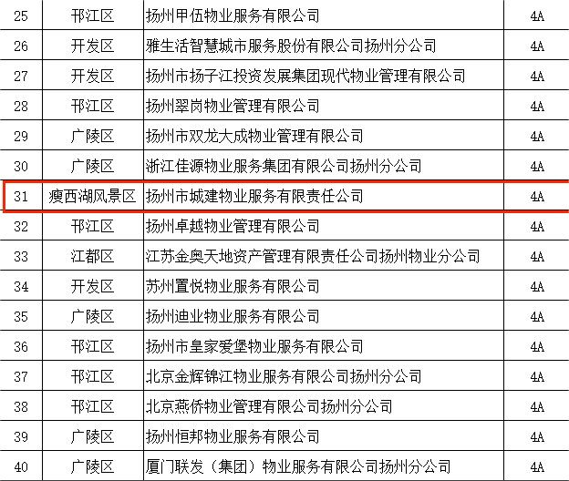 近日,《2022年度揚州市區物業服務企業信用等級》公布,城建物業公司再次獲得揚州市4A級物業服務企業信用等級評定,連續3年在所屬蜀岡瘦西湖景區的11家物業企業信用評級中蟬聯第一,也是景區目前唯一一家AAAA級物業服務單位。